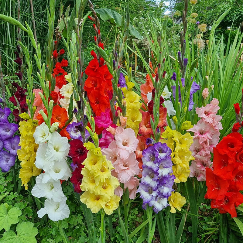 Bring weeks of colour to your garden with this lively mixture of gladiolus varieties. Each stem carries rows of 7–10 cm florets that open in graceful sequence from the bottom up, creating a vivid show of solid hues. A magnet for bees and a delight for cutting, these tall spikes add vertical drama and cheerful energy to summer borders. For a 2-month display, stagger plantings every week or so through early summer. Varieties are not individually labeled.