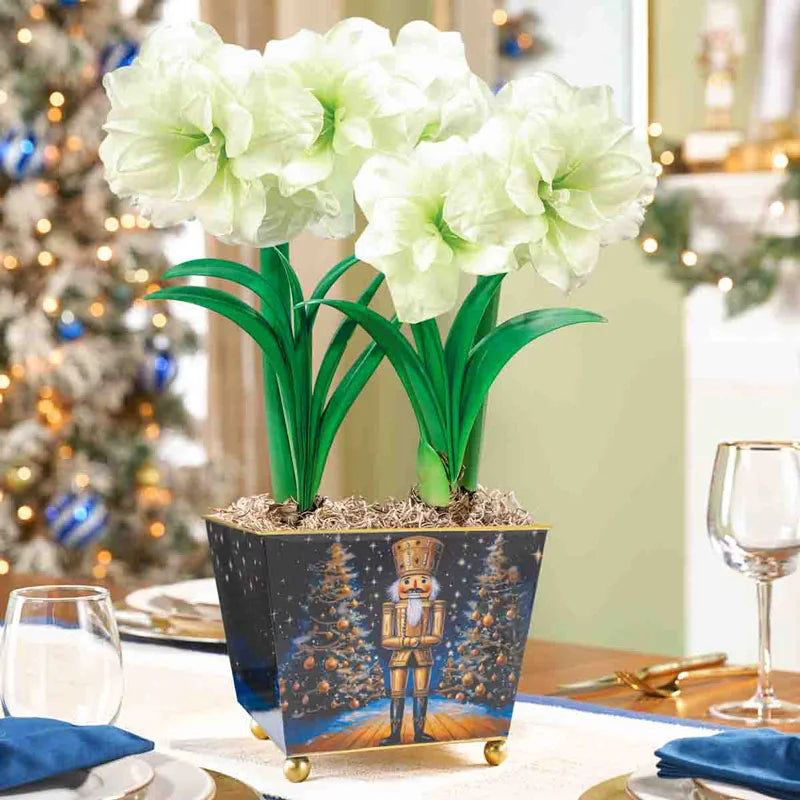 Step into a storybook winter night with one of our most breathtaking Amaryllis gifts. The elegant Alfresco dazzles with ruffled, snow-white double blooms and soft green centres—like moonlight captured in petals. Nestled in a deep blue, tapered metal pot trimmed in golden shimmer, this gift evokes the charm of a holiday ballet. A whimsical winter scene wraps the container, where a gilded nutcracker stands watch beneath a starry sky. Choose from single, duo or triple bulb plantings to share the season in unforgettable fashion. Each bulb produces 2-3 stems with up to five 15-17 cm flowers per stem. EXCLUSIVE (Single: 15 cm h, 17 cm w, 17 cm d; Duo: 18 cm h, 21 cm w, 21 cm d; Triple: 20 cm h, 22 cm w, 22 cm d)