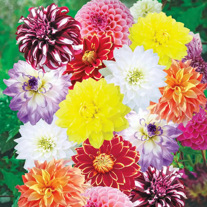 The vibrant colours and spectacular forms produced by this assortment of dazzling dahlias will amaze you and your visitors for years to come. Gorgeous in a sunny border and a must for your cutting garden. The mix features Dutch Carnival, Karma Maarten Zwaan, Tyrell, Mikayla Miranda, American Sun, Jowey Winnie and Tartan. Varieties are not individually labeled.