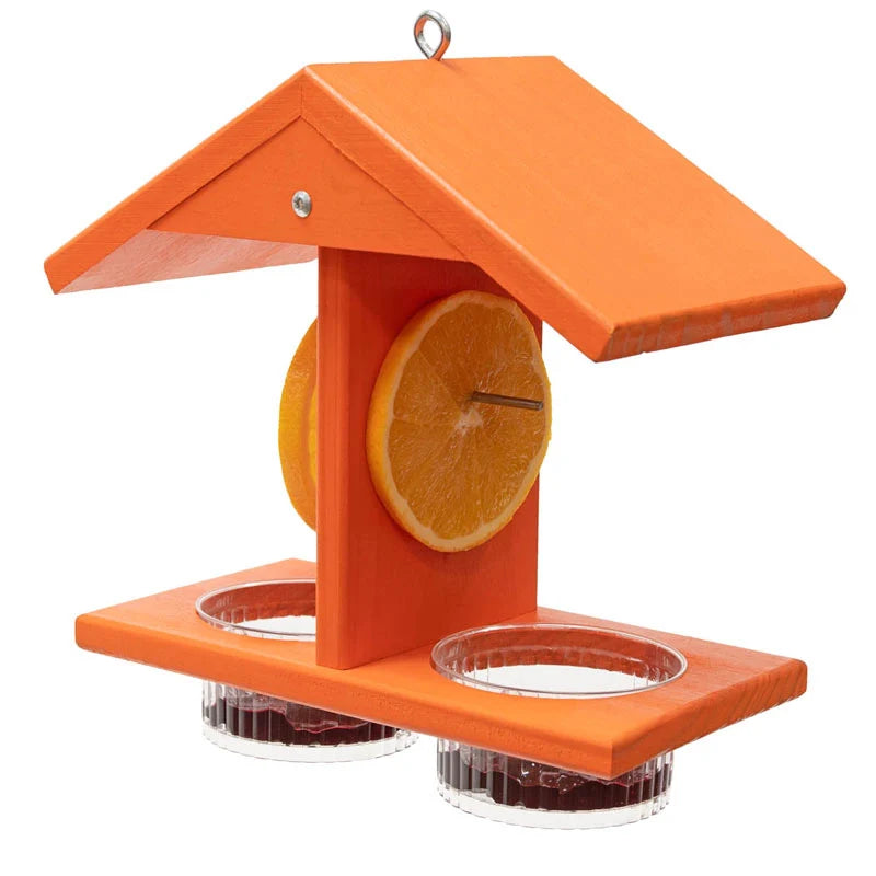 This double-duty feeder offers up a sumptuous meal for orioles while the unique roofline design keeps the food dry. Two plastic bowls hold jelly (an oriole favourite) and built-in prongs hold orange slices, enticing passing birds to visit the feeder. Sturdy enough to hold two feeding birds at once, it's made of durable pine and includes a metal eyelet for easy hanging. Easy to fill and clean.