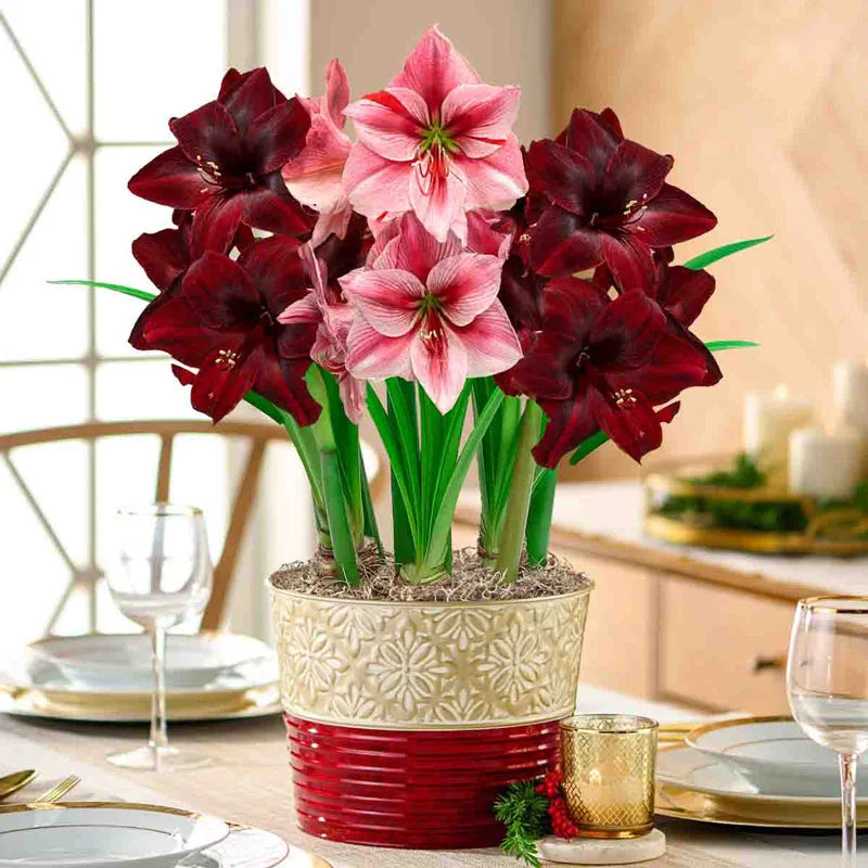 Celebrate the season with a gift that carries both tradition and beauty. Our bulb experts have preplanted three premium Amaryllis—two ruby-brushed Gervase and one velvety red Benfica—in a maroon and gold embossed metal pot that glows with timeless elegance. Each bulb produces up to 12 spectacular blooms, their rich hues evoking the cherished memories and lasting connections of the holidays. A thoughtful gift designed to return year after year, this trio is a living reminder of the moments we hold close. EXCLUSIVE (18 cm h, 24 cm dia.)