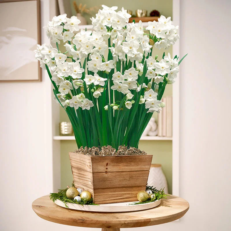 Enjoy a merry little burst of springtime blooms in winter with our Fragrant Paperwhites. Perfect for snow-dusted sills or seasonal tabletops, these cheerful blooms fill the air with fragrance and wonder. In just three to four weeks, nine pre-planted bulbs will awaken and bloom in flurries of dainty white blossoms atop 18" stems. Tucked inside a rustic square wooden pot, it’s a sweet gift that’s playful, practical and perfectly priced for holiday giving. EXCLUSIVE. (17 cm h, 23 cm w, 23 cm, d)