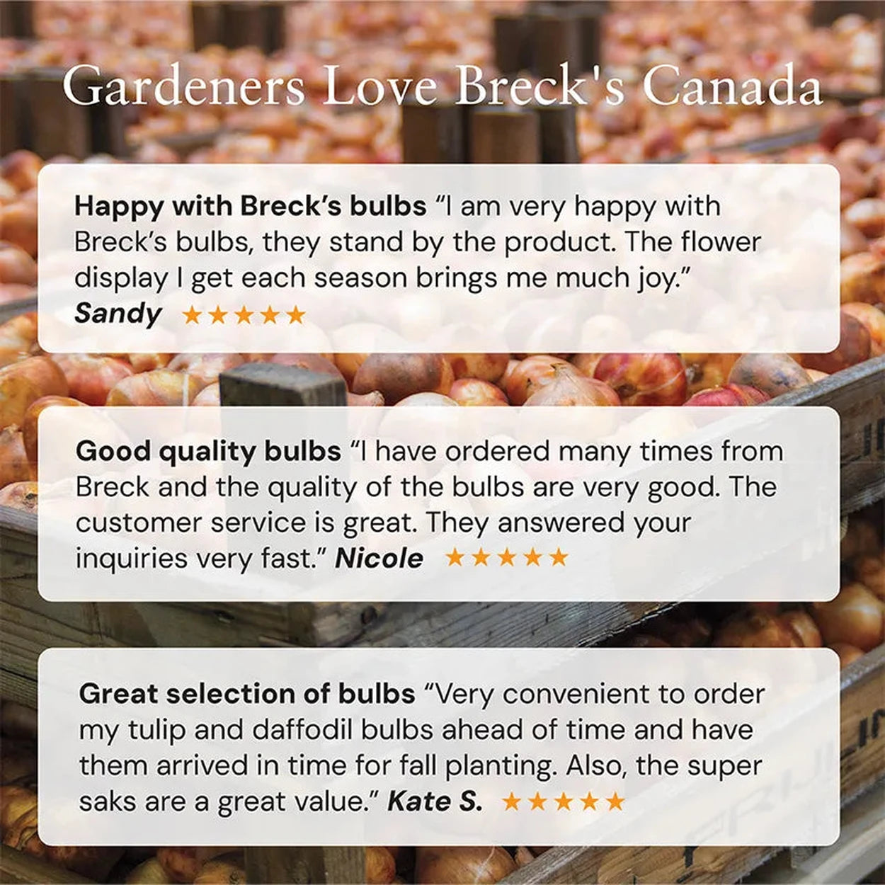 Over 200 Years of Customer Satisfaction. If, for any reason, you're not completely satisfied with any bulb, bareroot perennial or potted plant upon receipt, after planting or once it grows and blooms, just contact Breck's anytime—no time limit—for as long as you garden.