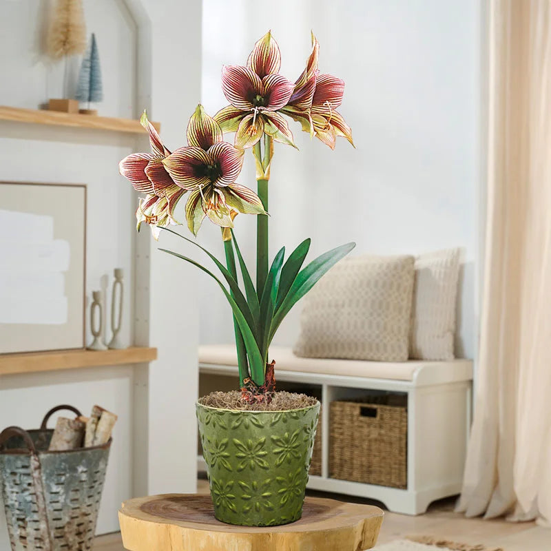 Beauty takes flight in this rare and uplifting bloom. Papilio (or Butterfly Stripe) Amaryllis is our most extraordinary variety, with orchid-shaped flowers that unfurl in soft pistachio green, traced with burgundy veining like the flutter of delicate wings. Pre-planted in a cheerful galvanized green metal pot with an embossed design, it’s a gift that brings colour, elegance and delight to the season. Perfect for the amaryllis aficionado—or anyone who loves to celebrate life’s rare and beautiful joys. (16 cm h, 18 cm dia.) EXCLUSIVE.