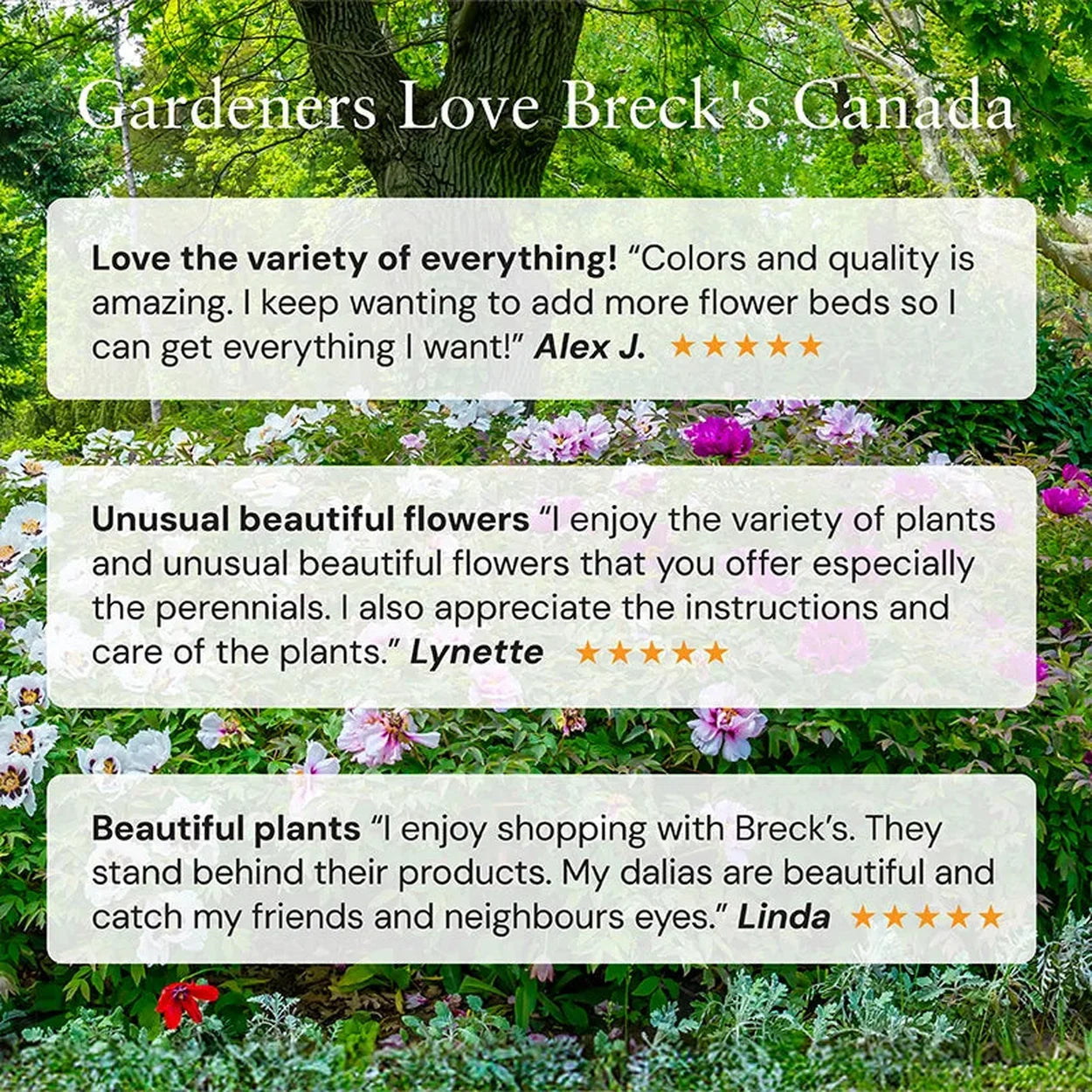 Over 200 Years of Customer Satisfaction. If, for any reason, you're not completely satisfied with any bulb, bareroot perennial or potted plant upon receipt, after planting or once it grows and blooms, just contact Breck's anytime—no time limit—for as long as you garden.